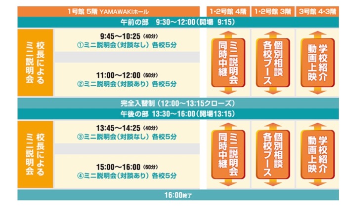 ミニ説明会は、各校の校長が5分ずつ説明いたします。11:00~と15:00~の回は対談も実施いたします。