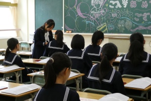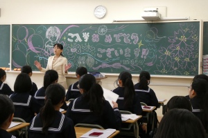 中学生の登校時はあいにくの曇り空となりましたが、新入生は桜の木の下や、渋谷に校地を構えてからずっと残る正門の門柱のそばなどで、記念撮影をしていました。また、外や廊下では、在校生が新入生のサポートをしました。教室の整備も在校生が行い、黒板には歓迎の言葉やイラストが並びました。