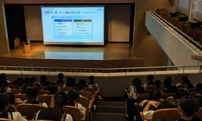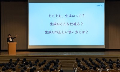 9月30日の6時限目に、株式会社マイパレCEOの岩井さんをお招きして、高校生を対象に生成AIのガイダンスが開催されました。(中学生も後日、開催予定です。)