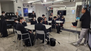 次に訪問したのは、日本橋を中心にライフサイエンス分野のイノベーションを支えるLINK-J(一般社団法人ライフサイエンス・イノベーション・ネットワーク・ジャパン)です。ここでは、「イノベーションとは新結合である」という考え方のもと、技術・資金・人材・アイディアといった「点」をつなぐことで新しい価値が生まれることを学びました。製薬企業とAIスタートアップの強みと弱みを補い合う事例などを通じ、オープンイノベーションの意義を具体的に理解する機会となりました。また、登壇者の中西氏からは、留学や進路選択を通したご自身の経験を踏まえ、「自分の居場所をいくつ持てるか」「世界をどれだけ広げられるか」という、中高生にとって示唆に富むメッセージが送ら、本校生徒も積極的に質問していました。