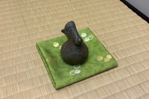 この時期ならではの軸や茶花、さらには家元から伝わる大変貴重なお道具を拝見します。香合は午年にちなんで、馬がかたどられたものが飾られました。さらに軸は、「春入千林處々鶯」(はるはせんりんにいりしょしょのうぐいす)とあり、表千家の新春のお茶席によく掛けられるものです。「春になり、林という林から鶯の声が聞こえてくる」。初春の明るい情景が浮かんできます。先生からは、9月のときわ祭で掛けられる軸の「秋沈萬水家々月」(あきはばんすいにしずむかかのつき)と対句になっている、というお話をいただき、生徒たちはより一層興味深く拝見しました。