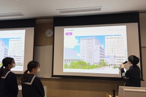 前半は、建設を担当する東急建設株式会社の設計担当者様より、スライドを用いて新校舎のデザインや内部の設計について説明がありました。ラボラトリー(ものづくりスペース)、畳のスペース、インナーバルコニーなど、第1回目のワークショップで生徒たちから出されたアイデアを元にしたスペースが、実際の設計図やイメージ図で紹介されました。